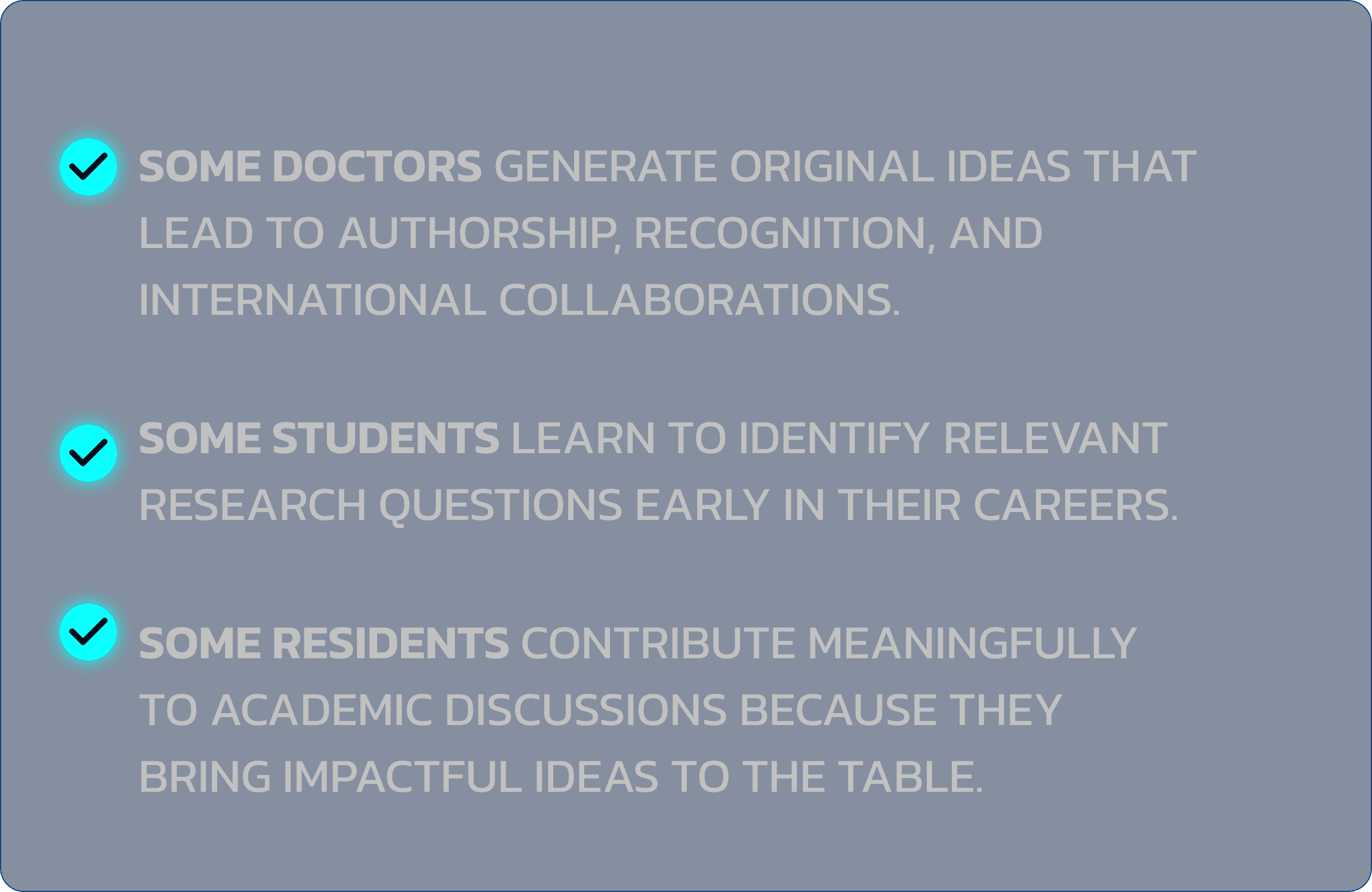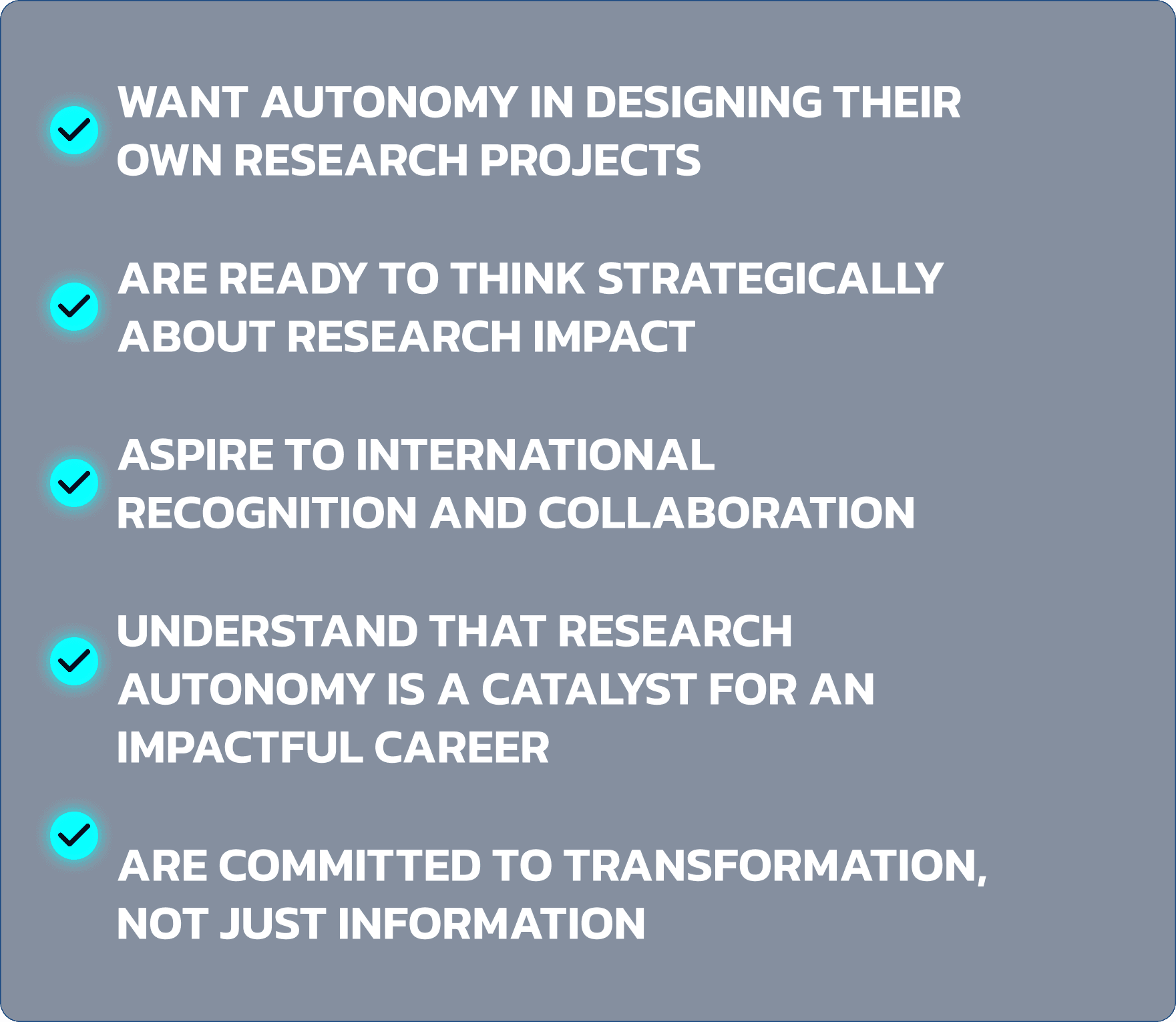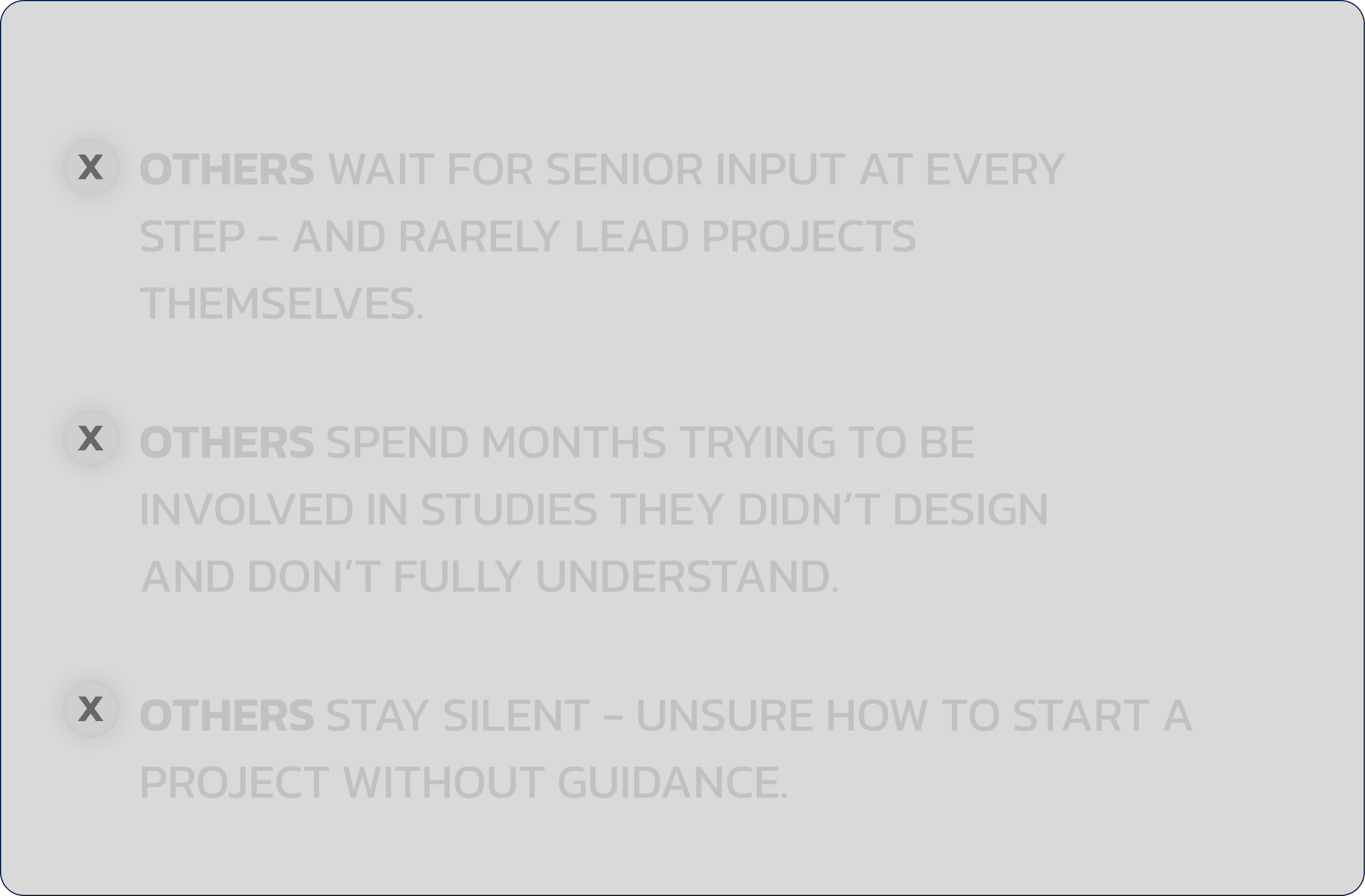 The ability to create meaningful research ideas with structure and clarity - not by chance. To lead your own projects, even without needing a lab or institutional support. To think independently about what’s relevant, and to know how to structure ideas that lead to real opportunities.